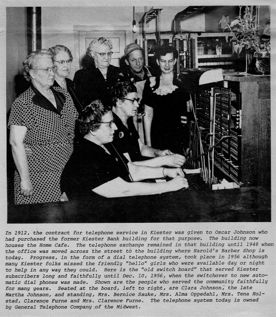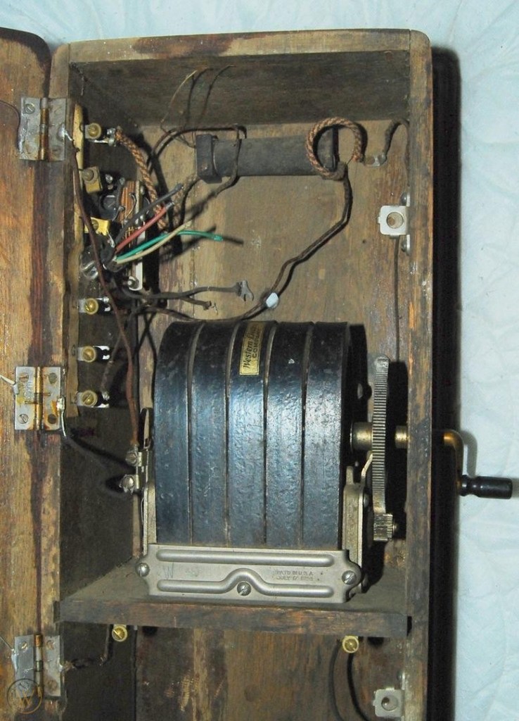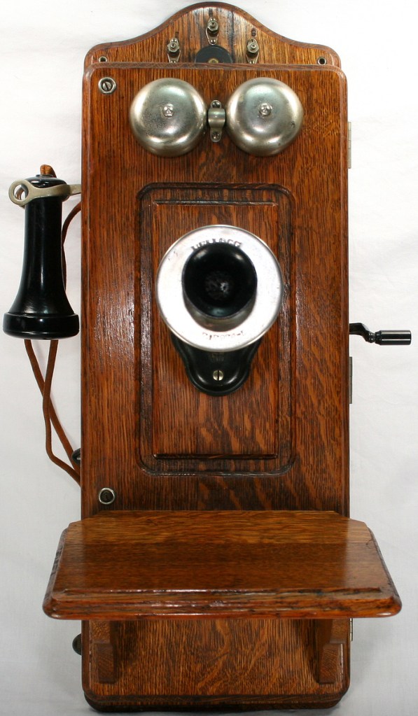 That morning, while our father was savoring mother’s excellent breakfast, a ringing sound came from our family Living Room. On the east wall, above Russell’s farm business desk, hung a wooden, rectangular “coffin crank” phone (likely a Stromberg-Carlson model).βThe early wooden phones of that day had been dubbed with the title “coffin” phones because of their similar resemblance of the long wooden boxes that were used to bury the dead. Most of these early telephones consisted of two bells, at the top, to announce, in audio fashion, that someone was trying to reach you. There was also a hand-held ear receiver that hung to the side of the wooden phone on a hook switch. After picking up the ear receiver, you would place that device to your own ear to hear someone speaking to you. A transmitter arm, with voice cup, stuck out from the front of the telephone. A person leaned into this device and talked. Your voice was then sent by wires to the local or distant location of the person you wanted to talk to. Finally, there was a crank on the right side of the telephone’s wooden cabinet. Usually, to make a call, you’d give the crank a series of turns. That cranking action generated an electrical charge that caused bells to ring at the Telephone Operator’s office in our hometown of Kiester. Then, the Operator helped connect you with whoever you wished to speak with.