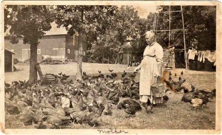 While Edwin harnessed “Sugar” and “Cane”, that resplendent Iowa sunrise was made even more illustrious by the happy cackle of an immense flock of chickens that gathered round Kjerstie Tollefson (Edwin Noorlun’s mother-in-law). That battered old galvanized bucket she carried was magic, as far as those feathered fowl were concerned, because from it, our great grandmother brought out handfuls of golden grain and broadcast it to the ground in the yard of their much loved farm. Those feathered friends of hers clustered near her as if she was “The Pied Piper of Hamelin Town”.