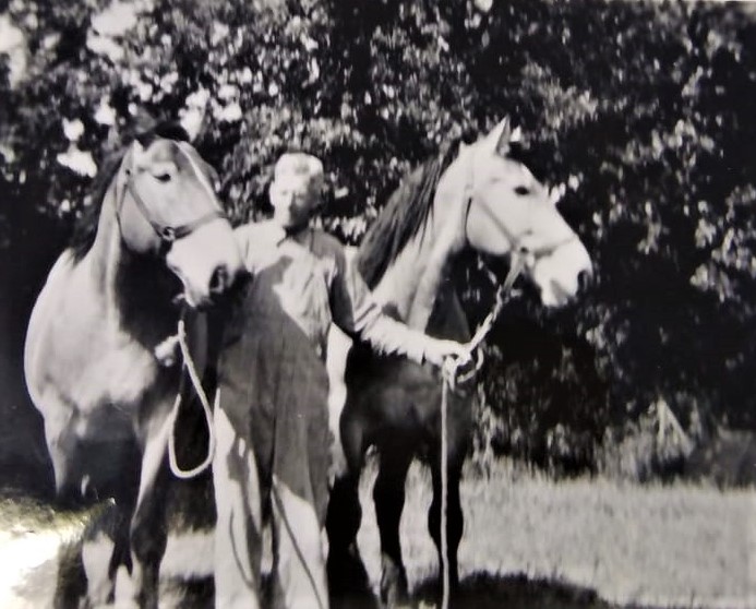 Gentle equine snorts, from “Sugar” and “Cane”, fluttered their soft, hirsute nostrils in the amber glow of dawn’s light filtering through the dusty barn windows. Weighing a full 2,000 pounds each, these massive Belgian draft horses rippled with muscles, yet their hearts were reciprocating the tenderness of their approaching master horseman (our grandfather, Edwin A. Noorlun) as he rolled aside the track-type barn door and entered that livestock repose to begin another day on the Ingebret Tollefson farm five miles east of Lake Mills, Iowa.