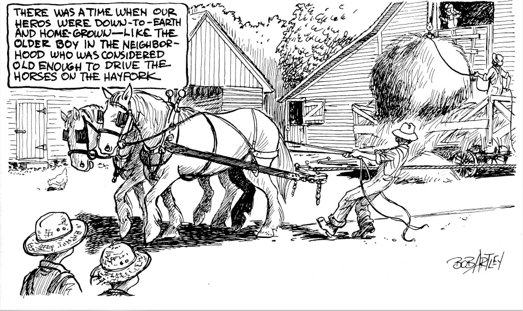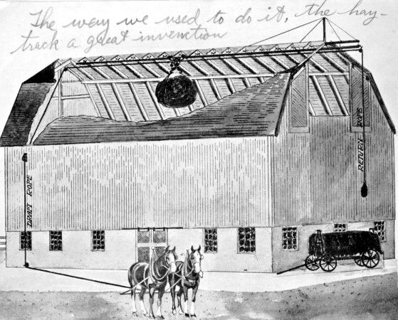 “Sugar” and “Cane” now had a new job that day. They were unhooked from the Hay Wagon and re-positioned at the corner of the barn. The back wooden “evener” of their harness was now attached to a strong, thick, VERY long rope that traveled inside the barn, around various pulley wheels and, eventually up to the Hay Mow and out the large, open Hay Mow door.