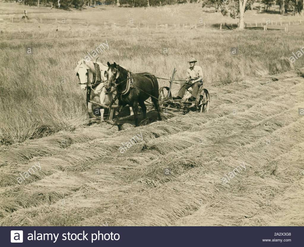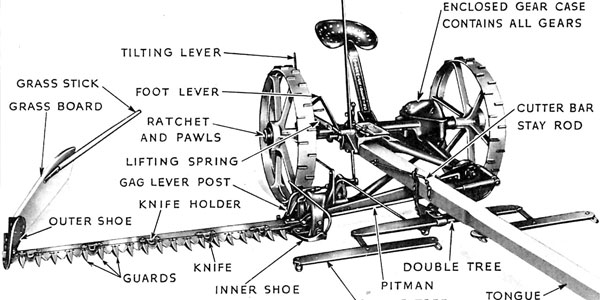 Bedecked in the unison of their impressive leather harness, “Sugar” and “Cane” stepped lively now from that classically-styled barn. With heads high and energy fresh they were a handsome pair and ready for work. Walking behind his team, Edwin had gathered the horse’s harness reins in his sinewy hands while he ‘steered’ those draft horses to the Sickle Mower by pulling more on the left reins (for a left turn) or pulling more to the right reins (for a right turn) of the team. With voice commands and a gentle, even pull, “Sugar” and “Cane” were obedient to their master and backed up to the sickle-bar mower machine. Edwin hooked up the implement, climbed aboard the steel seat and drove the team out to the grass hay field for mowing.