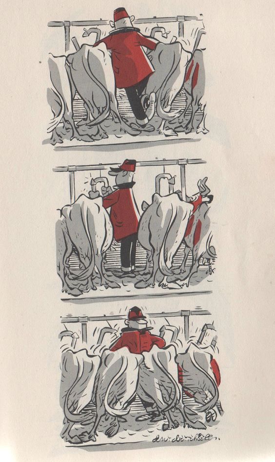 As Dad opened our ‘Dutch’ (top and bottom) barn door that day, he saw to it that all of his ‘regular ladies’ could enter the barn and head for their own stanchions where they began their joyous munching and crunching. The food was usually corn silage, grain and even a vitamin-rich powder concentrate we sprinkled over the top of each ‘meal’; which they treated like a tasty dessert. Betty Bovine was trying to get in the barn door with the rest of the ‘girls’, but Dad would shoo her away……..at least for the moment. Once the regular herd were inside their stalls, Dad then went between the cows to lock their stanchions on each side of their necks to gently hold them in their spot while he milked them. Sometimes, poor Daddy encountered what I call, ‘The Farmer Squash’. For some strange reflex reason, as he’d try to step out from between two cows, they’d squash together and trap Dad with their soft, big bovine bodies. After a few slaps, though, they got the message that Dad needed to get out and they’d separate.