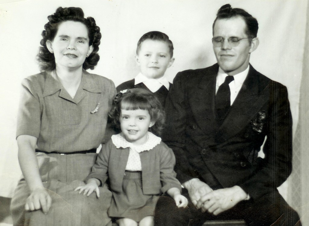 Elliott’s mother, Clarice (L), his big brother and sister, Lowell & Rosemary (Center) and their father, Russell (R). 1949.