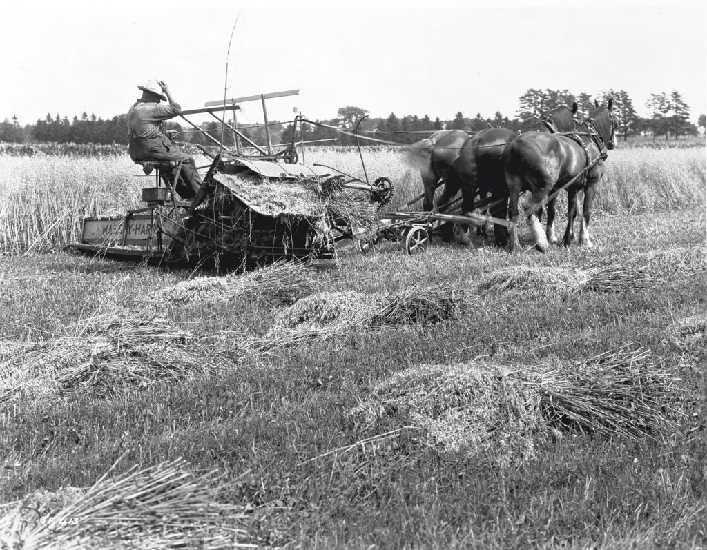 The rippling and well-defined equine muscles of grandpa’s BIG draft horses, “Sugar” and “Cane”, quivered with happy anticipation to be part of another day on the farm there with Grandpa Ed. Our Norwegian elder was a first generation, born in America, man. The year of 1888 saw Edwin’s birth into this world and, like his father before him, he grew up in the era when horses were still the honored source of power in all agricultural vocations. Ed loved his horses and had followed in the footsteps of his father, Arne, before him as he, too, chose to be a farmer of the land and enjoyed seeing what it could produce. Matter of fact, our grandfather never used a tractor on his farm……only horses. With the new day before him, Edwin led his two, tall and mighty steeds from their barn stalls and mounted a full working harness on each of them for the day’s task of cutting and binding oats.