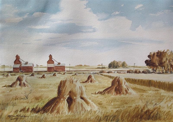 With the field of oats now cut and bound into sheaves, it was time for our grandfather, his sons and other workers to begin walking around the field grabbing and standing up the sheaves into vertical piles of three or more sheaves called a “stook”(also known as a “shock”). Pretty soon the oat field was dotted in picturesque teepees of stooks(or “shocks”). The reasoning for this practice was to allow the brisk prairie winds to dry the grain, rather than allowing the cut grain to lay on the ground where it was susceptible to moisture and rot from the morning dew, light showers, etc..