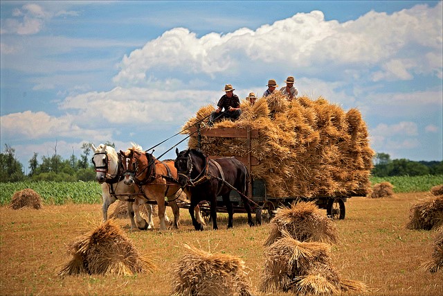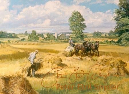 With his team harnessed and ready for work, Ed took up their reins, gave them a gentle ripple slap across their backs and made a “Chick, Cherup” sound with his mouth to move “Sugar” and “Cane”, at a walk, out to their oat field. Once on site, Grandpa Ed gave a long, steady pull on the reins while verbally commanding his team to “Back, Back” up as they obediently moved in reverse. Once in position, they were then hooked up to what’s known as a Grain Binder or Reaper. Ed climbed aboard the seat of this magic machine, engaged its gear system and with a slap of the reins “Sugar” and “Cane” pulled forward and began cutting a wide swath of oats as they moved along the field. The Binder would cut down and then move the long, cut grain stalks to the side of the machine and, every so often, a device would wrap a twine around a large bunch of the long grain and drop it to the ground. The bundle of tied, long grain was now called a sheaf. The plural form of that grain, now in many bundles on that field, were now called sheaves.