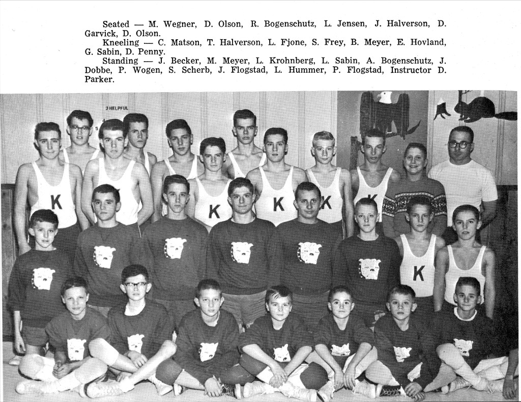 1963-64 Kiester High School Wrestling Team led by Mr. Parker and Mr. Koenck. This was the second year that Elliott’s school had a wrestling team.