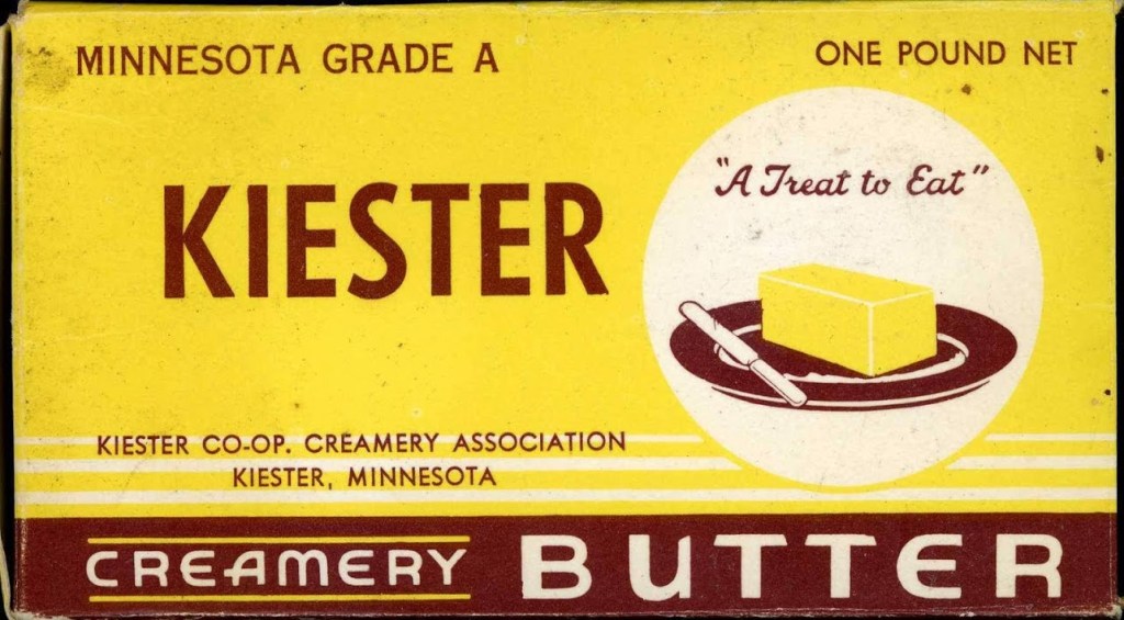 Having been raised on true-to-goodness, bona fide creamery butter, I could never imagine Mom cooking, or our family eating, any food without golden, genuine butter. Our Kiester Co-op Creamery Association displayed a ‘no brag, just fact’ promotion on every butter carton that left their plant in town…….”A TREAT TO EAT” and that was gospel, for sure!!! π