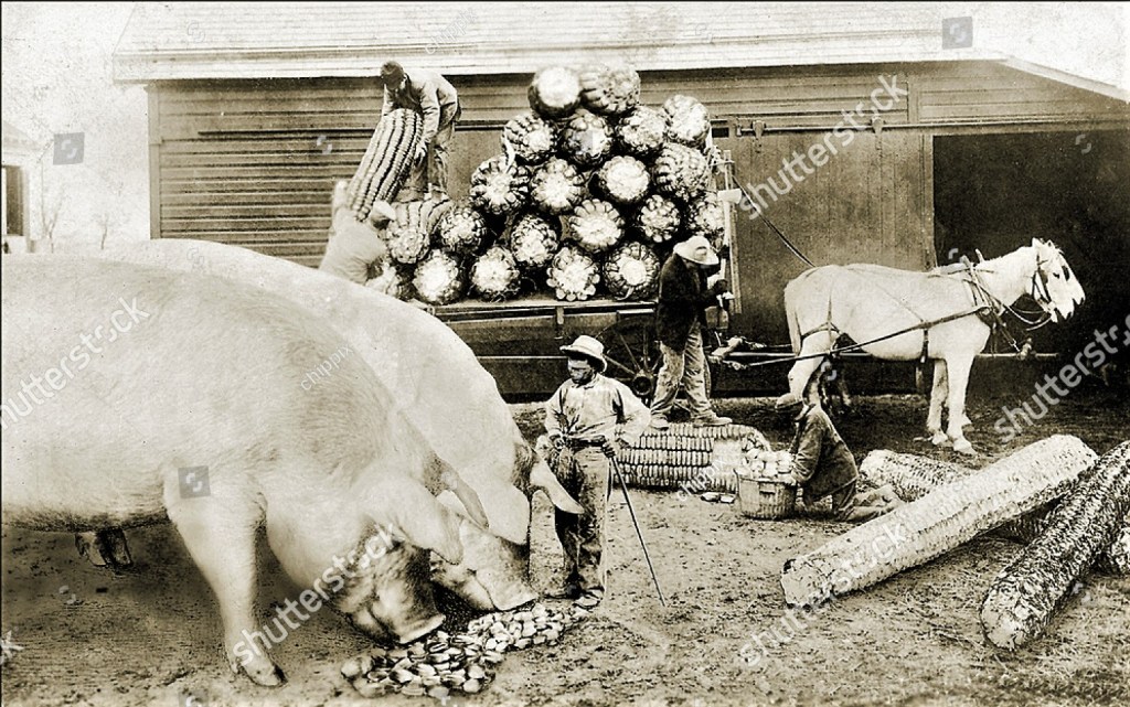 Grabbing two, stout metal five gallon buckets, and with my breath vapors in the icy air, I stepped over to the wall of the Granary and slid up a vertical hatch door that, to me, was magical in itself. The pioneers (I seem to recall their last name was Santmaier or Sandmeyer) who constructed this granary in the mid to late 1800’s, created an ingenious, inter-connecting, enclosed chute system that allowed grain from the second floor of this animal food edifice to gravity-flow down and out of that little vertical hatch door. All I had to do was slide up that hatch door and the golden goodness of hog feed filled up those two buckets in a lickety split!!