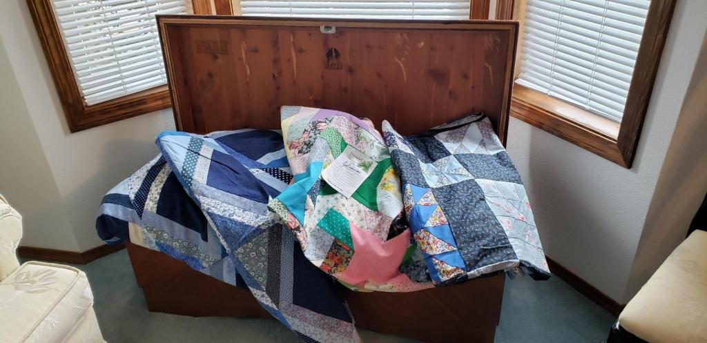 The gift of a quilt, made by Elliott’s mother before her death in 2017, is still held in loving care within this fragrant, cedar-lined Hope Chest of hers now in the tender care of his sister Candice’s home.