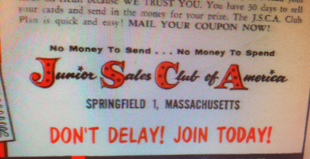 Eventually, through perseverance and the generous hearts of family and neighbors, I had finally achieved my sales goal and collected the dollars necessary to send in my order to the “Junior Sales Club Of America” office.