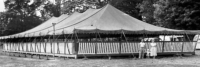 For there, below the cooling shadow of our village water tower, began the rhythmic ring of sledge hammers, being thrown in muscular cadence as workmen began sinking iron posts into the soil for anchoring ropes to help hold up the magnificent and immense tent that held all the royal looks of one of those regal tents of King Arthur’s day.