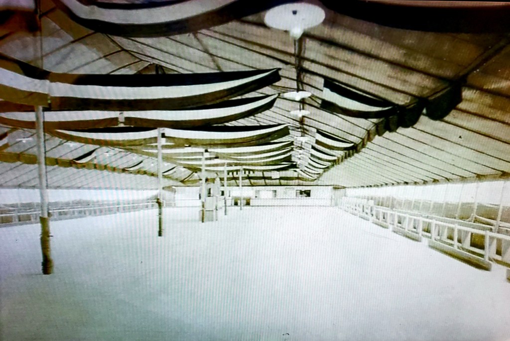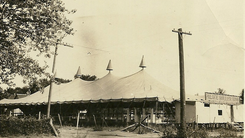 When finished, there in all its roller-skating glory, was a beautiful wooden floor, beneath that fabric-tented attraction, that seemed to stretch on for an oval mile with guard rails and benches along the perimeter for skaters and spectators alike to drink in the joys of skating the day or evening away.