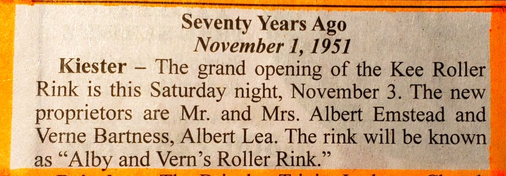 Many a young Kiester youth like Arnold Bauman, Clair Hagen and Leroy Larson were just a few of the young men who tenderly helped lace up the high-topped roller skates of the young ladies with whom they were ‘head over heels’ in love with. Together, these young couples smiled and cuddled as they slow skated, under the spot-lighted mirror ball to love ballads of that era like…..”Because Of You (Tony Bennett)”, “Secret Love” (Doris Day) and “You Belong To Me” (Jo Stafford). Long, happy marriages came to fruition for these Kiester area couples who found love and enjoyed roller skating there in our beloved hometown of Kiester, Minnesota ……..just like, in another era later on, did this Norwegian Farmer’s Son.