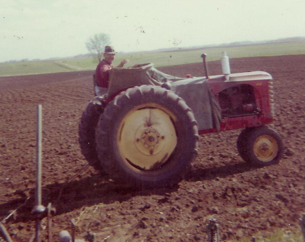Our beloved ‘other grandpa’, Harry Bauman, on a Massey-Harris 44 tractor ‘dragging’ a field (a finishing process before planting). May of 1963.