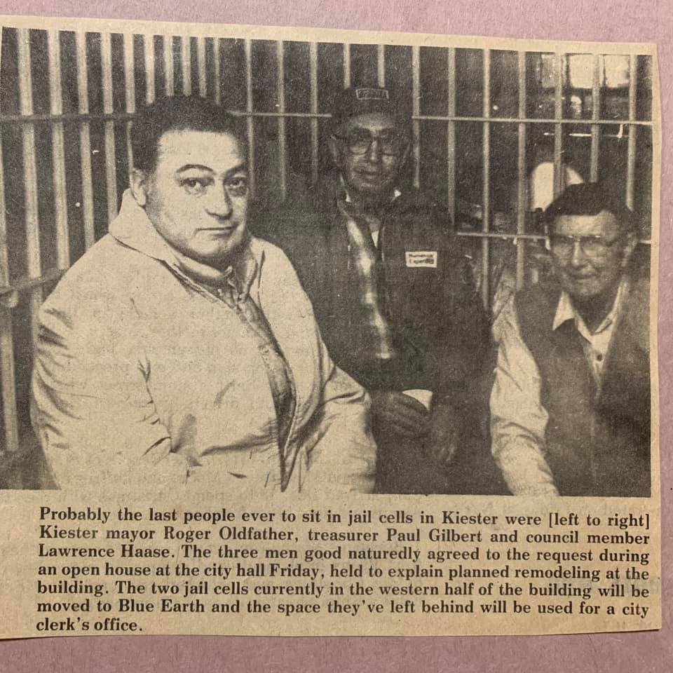 Three local townfolk visit Kiester’s very lonely jailhouse. 😉 L to R…Roger Oldfather, Paul Gilbert and Lawrence Haase.